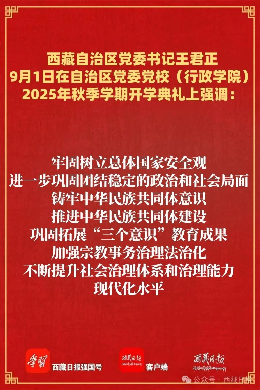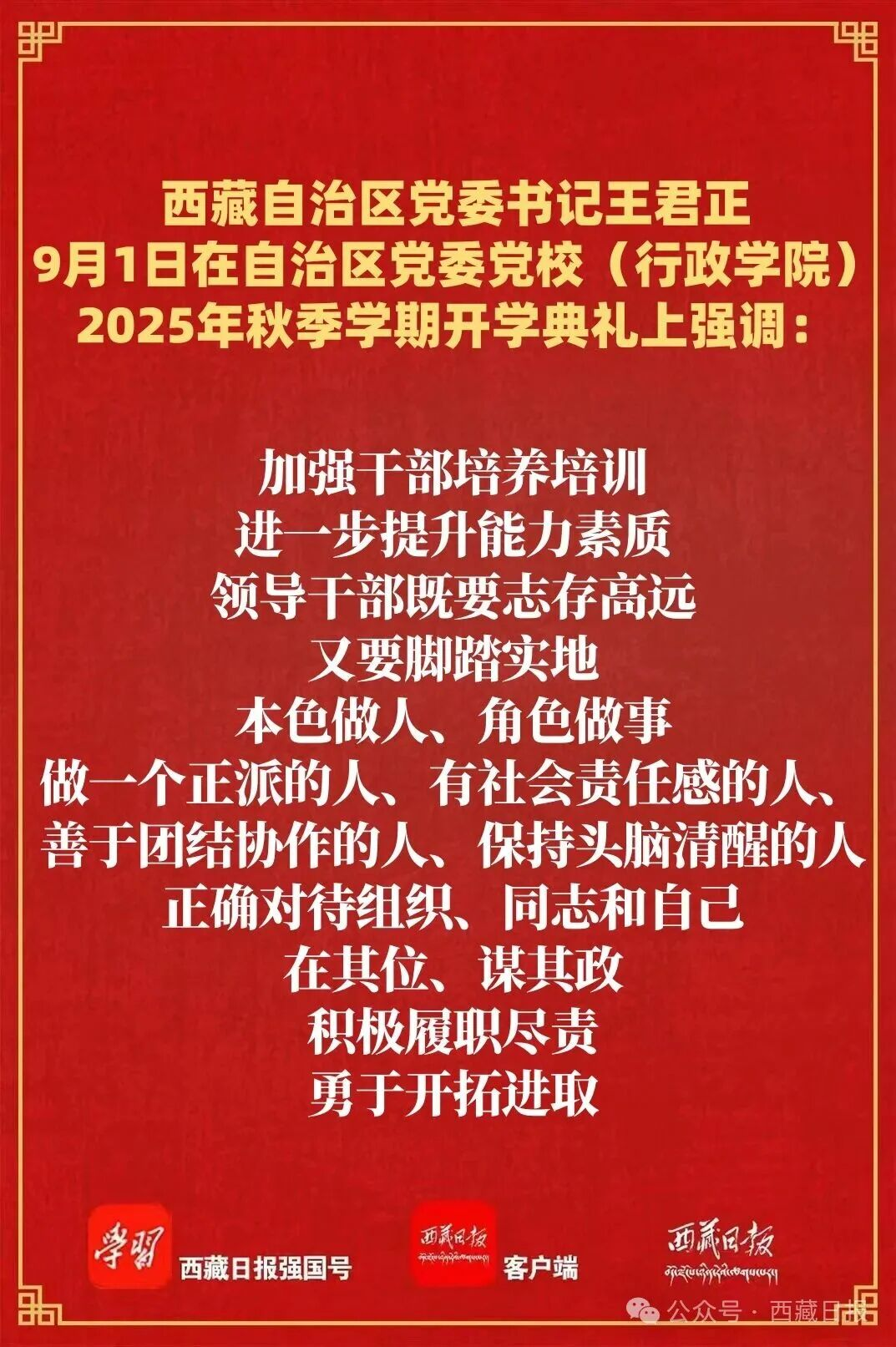 9月1日,自治区党委党校(行政学院)举行2025年秋季学期开学典礼,自治区党委书记、自治区党委党校(行政学院)校长(院长)王君正出席并讲话。他强调,要坚持以习近平总书记在西藏视察时的重要讲话精神武装头脑、指导实践、推动工作,不断提升干部能力水平,抓好“四件大事”落实,努力建设社会主义现代化新西藏。